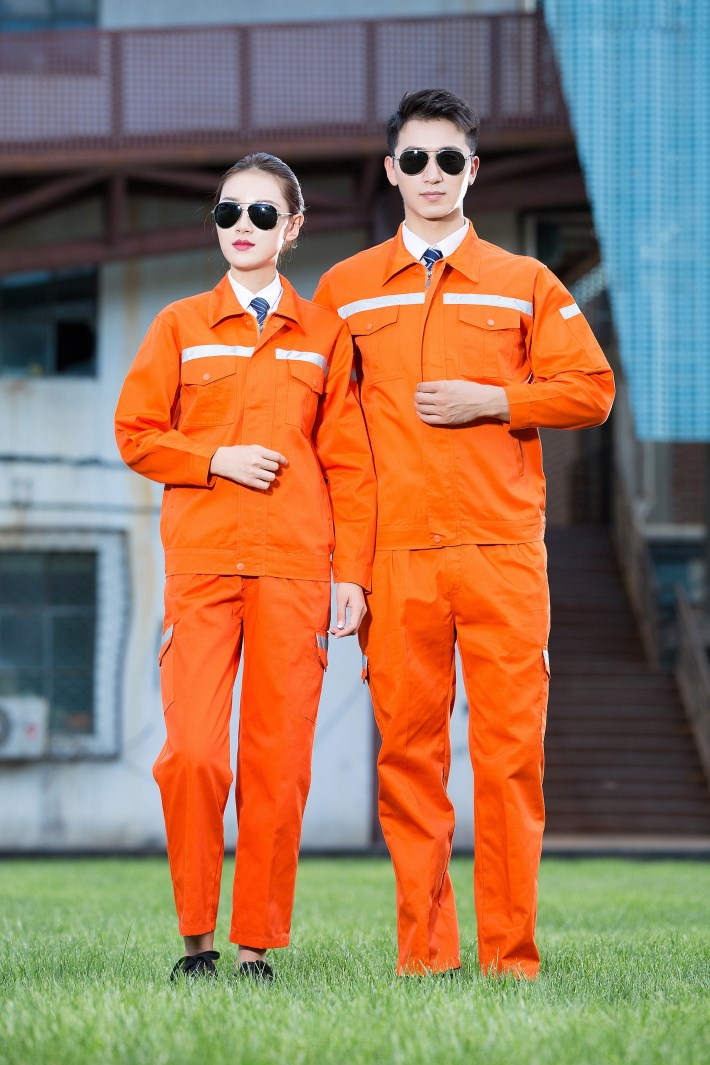 合肥廬江縣工作服定做款式廠家推薦橘黃色工程服環(huán)衛(wèi)勞保服GZ-8009